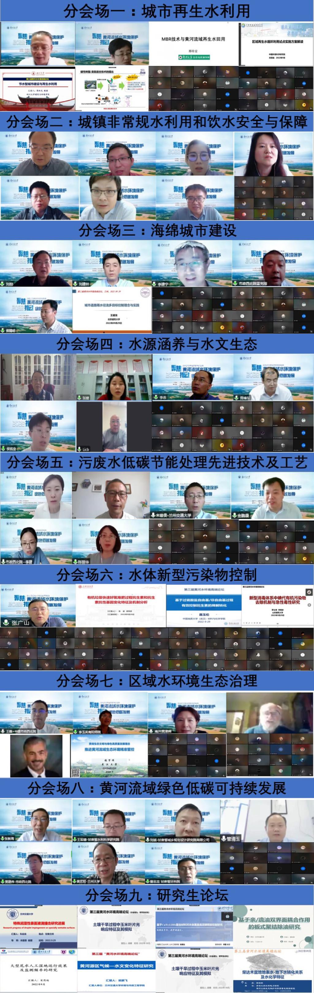 中国工程院院士王浩、彭永臻,清华大学教授胡洪营,爱尔兰都柏林大学教授赵亚乾,兰州交通大学副校长贡力分别为大会作了主旨报告,论坛共设置“黄河流域绿色低碳可持续发展”“区域水环境治理”“村镇非常规水利用和饮用水安全与保障”“城市再生水利用”等9个分论坛,来自中国科学院大学、上海交通大学、哈尔滨工业大学、同济大学、四川大学、美国科罗拉多州立大学、捷克生命科技大学等46所国内外知名高校专家学者,为本次论坛提供了60余场精彩的专题报告,论坛的成功举办为黄河流域生态环境保护和高质量发展建言献策并提供智力支持。