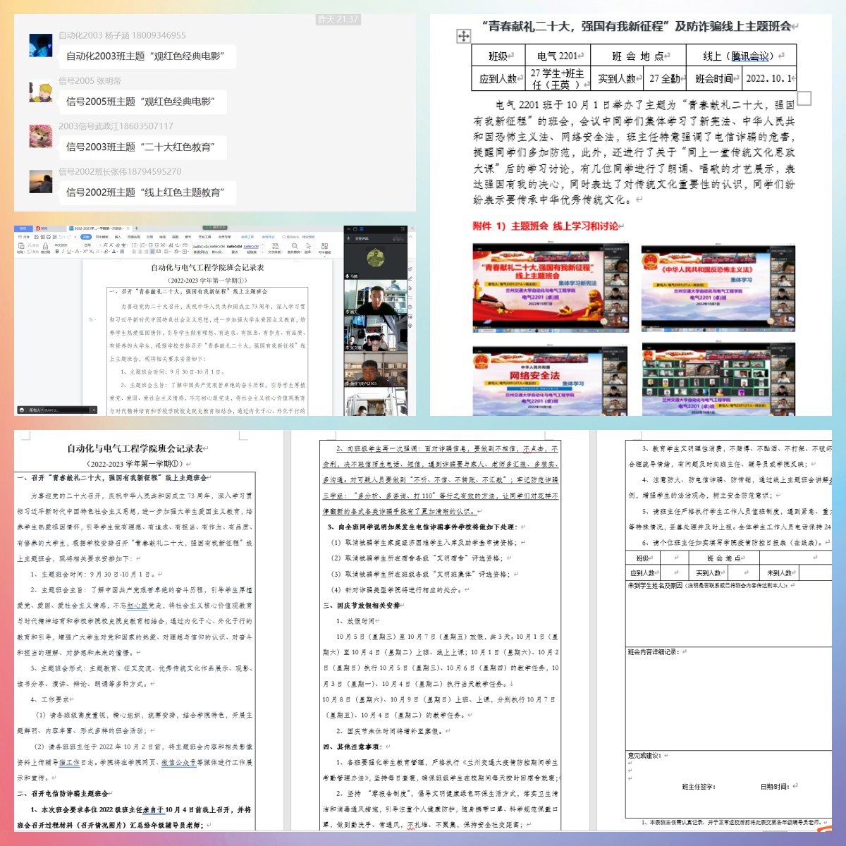主题班会召开前,各个学院根据学校的安排部署,结合学院工作实际,拟定班会主题、确定班会形式、明晰具体流程,会后各班自觉组织热烈讨论,营造浓厚氛围。各班级通过主题教育、征文交流、优秀传统文化作品展示、观影、配音、读书分享、演讲、辩论、朗诵等形式多样、内容丰富、寓教于乐的教育方式,展示祖国新时代伟大成就,帮助同学们认清当前形势任务,理解大学生使命担当。各班级主题班会上,通过讲述先进模范事迹,同学们立志要在奋斗中绽放青春绚丽之花;通过阐释以伟大建党精神为源头的中国共产党人精神谱系,传承红色基因;通过主题影视剧播放,展示新时代建设成就、新时代人物风采,号召同学们在青春的跑道上跑出当代最好的成绩;通过观看“红色瞬间”微视频,感受基层一线优秀共产党员良好精神风貌,充分领悟身边先进典型在各条战线、各个领域、各项工作中取得的优异成绩,感悟信念坚定、践行宗旨、拼搏奉献的崇高品格。