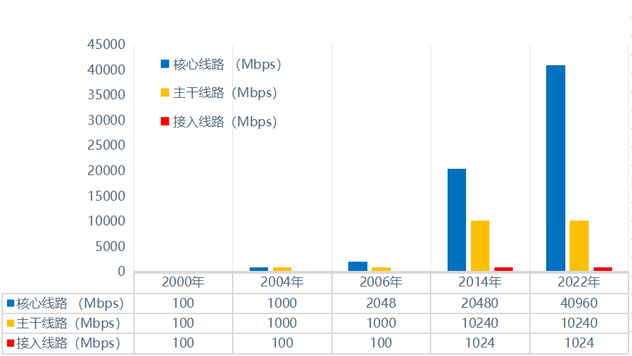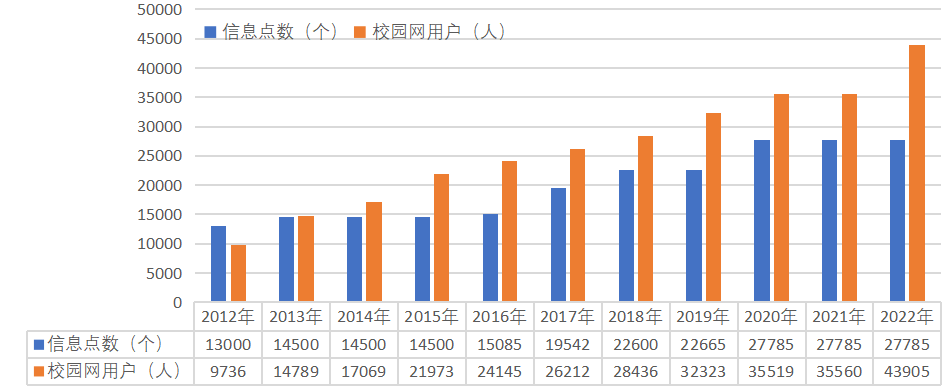 不断加强校园网络基础设施建设,夯实校园信息化发展的基础。我校于2000年实现了办公区域的全覆盖,建网以来,校园网建设一直保持着稳中有升的态势,在2012年校园网出口带宽提升到1.3Gbps、校园网用户有9736人。为了提升校园网承载能力,2014年完成了校园网出口设备的万兆链路改造、核心主干设备的20G链路互联以及楼宇汇聚和接入设备的升级、校园网出口带宽提高到3.5Gbps,校内外互联速度显著提高,校园网用户达到17069人。2022年,随着校园无线网络的建成使用,校园网络承载能力进一步提升,信息接入点达到27785个、光纤铺设总长度超过110千米、核心设备12台、出口带宽提升到10.3Gbps、校园网用户超过43000人。目前校园网络已实现了校内全覆盖,采用有线网和无线网一体化认证方式,并与统一身份认证平台对接,为广大师生提供着安全便捷的网络服务。