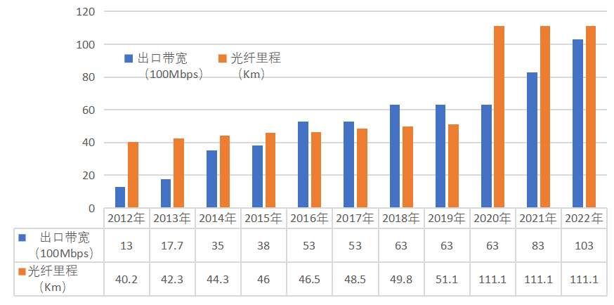 图2十八大以来校园网出口带宽与光纤里程增长图