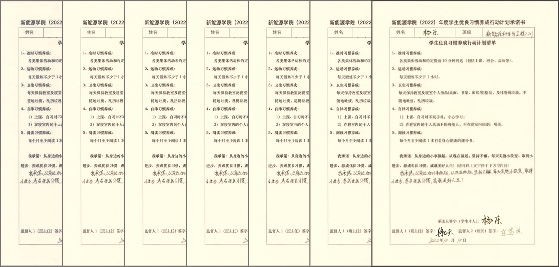 一份承诺函,砌起学风建设首块砖。习近平总书记嘱托:“广大青年要坚定理想信念,志存高远,脚踏实地,勇做时代的弄潮儿。”学院每学年从大一学生开始实施“大学生优良习惯养成行动计划”,养成行动计划四年不间断。根据学生特点和实际需求拟定承诺目标,从“守时习惯、运动习惯、卫生习惯、自律习惯、阅读习惯”等五个方面制定不同阶段切实可行的优良习惯养成清单,组织学生签订《新能源学院学生优良习惯养成行动计划承诺书》,从“自我监督、朋辈监督、辅导员监督”三个维度对学生的承诺进行考察,了解学生优良习惯养成情况。