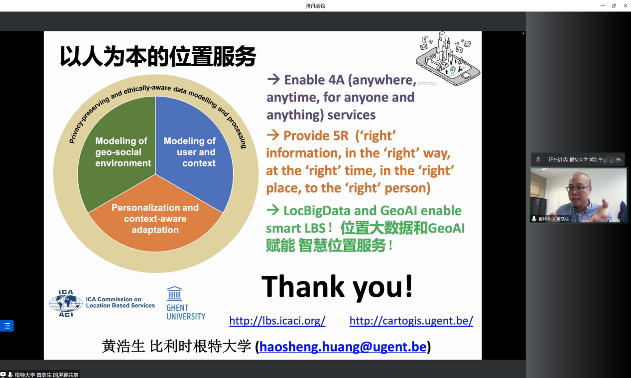 报告中,黄浩生简单介绍了根特大学CartoGIS实验室及研究方向。接着系统介绍了他本人任创会主席的国际地图组织(International Cartography Association)位置服务(Location Based Service,LBS)专委会的基本情况及LBS方面的研究趋势。黄浩生从以人为本的位置服务出发,引出报告主题——位置大数据及GeoAI 赋能智慧位置服务,并围绕地理及社会环境建模、用户及其上下文信息建模、个性化及自适应服务、顾及隐私与伦理的数据建模及分析4个关键问题展开讨论并辅以丰富的实例进行讲解。