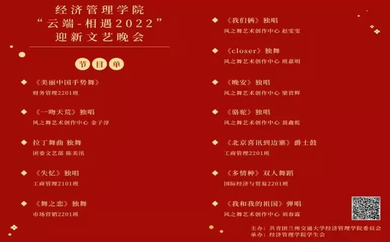 晚会由遇见•重逢、奋进•恒志、缘聚•启航三个篇章组成。一曲《closer》向我们展现了人生旅途中,总是有着不期而遇的惊喜,婉转悠扬且寓意深切的歌词,时刻提醒着同学们在新的人生起点上,要珍惜每一次相遇,期待每一次重逢,审视每一次缘分,充分展现了新时代大学生珍惜同学情谊,勇敢面向未来的青春形象;由新疆少数民族同学带来的舞蹈《舞之恋》以新疆少数民族热烈激情的舞姿,展现同学们积极乐观的生活态度以及对未来的美好憧憬;爵士鼓《北京喜讯到边寨》以架子鼓的形式,结合抑扬顿挫的韵律,充分展现了少数民族边寨的欢歌笑语以及同学们对美好生活的期待;手势舞《美丽中国》以指尖缠绕之温柔,完美诠释了经管学子对祖国繁荣富强热烈而真挚的爱;晚会最后,《一吻天荒》《失忆》为谢幕曲,不仅唱出了当代大学生对爱情“本该甘于平淡,却又不平淡;本该甘于平凡,却又不平凡”的全新理解,也唱出了学生们对美好生活的热切向往。