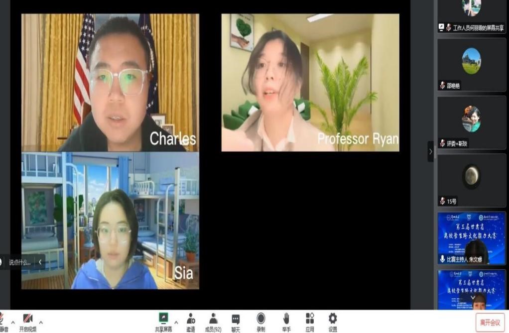 12月4日,由甘肃省教育厅主办,上海外语教育出版社协办的第三届甘肃省高校学生跨文化能力大赛由兰州大学在线上承办。由我校教师胡淑兰、邵艳艳指导,陈晓奇(外国语学院),贺镠璇(文学院),宋艺飞(经济管理学院)3名学生组成的团队喜获一等奖。