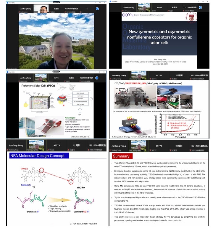 近日,应我校材料科学与工程学院和甘肃省有机半导体材料及应用技术工程研究中心邀请,韩国高立大学(Korea University)Han Young Woo教授通过Zoom视频会议为广大师生作了题为《NewSymmetric andAsymmetricNonfullereneAcceptors forOrganicSolarCells》的学术报告。我校材料科学与工程学院全体领导,材料学院、机电学院和研究院部分教师和研究生约140余人参加了本次报告,报告会由材料学院相关负责人主持。