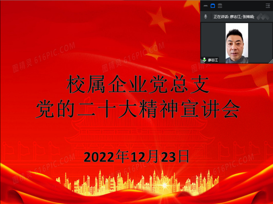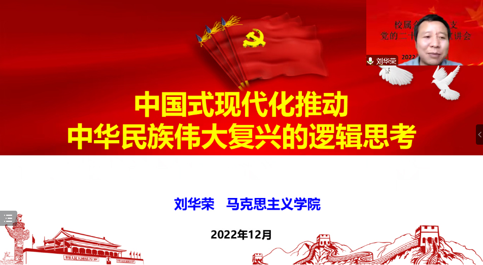 为全面深入学习宣传贯彻党的二十大精神,12月23日上午,校属企业党总支邀请马克思主义学院刘华荣副教授线上作了主题为“中国式现代化推动中华民族伟大复兴的逻辑思考”的宣讲报告。宣讲报告会由校属企业党总支负责人主持。