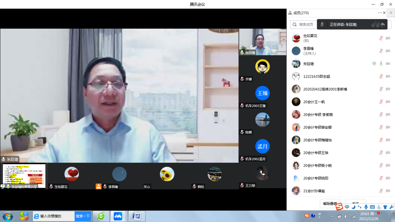 12月26日,校党委常委、副校长朱廷珺为分管和联系的后勤保障部、经管学院、铁道技术学院、MBA中心、继续教育学院、离退休教职工服务中心等6个单位的教工和学生党员作了党的二十大精神学习专题辅导报告,报告会在线上举行,共有师生党员270人聆听了此次报告,报告的主题为《牢牢把握高质量发展这个首要任务》。