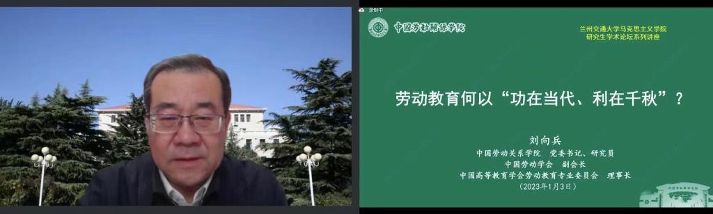 为深入研究阐释和贯彻落实党的二十大精神,帮助马克思主义学院全体师生更加深入学习和研究新时代劳动精神,树立正确的劳动观,自觉贯彻落实党的教育方针,培养德智体美劳全面发展的社会主义建设者和接班人,1月3日下午,我校马克思主义学院特邀中国劳动关系学院党委书记、中国劳动学会副会长、中国高等教育学会劳动教育专业委员会理事长刘向兵研究员作了题为“劳动教育何以功在当代、利在千秋”的学术报告。马克思主义学院全体师生、部分校友,以及学校教务处、学生工作处、研究生院等职能部门的负责人共计170余人参加了报告会,学院院长蔡中宏主持了报告会。