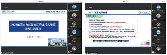 高全福详述了国家自然科学基金改革成效、2022年国家自然基金申请和立项概况、我校国家基金的现状分析;详细解读了2023年国家自然基金申请政策变化以及各类项目申报的要点,建议及时关注国家基金委政策导向、仔细阅读当年的申请指南、本科学部和项目所在外的最新要求、及时掌握同方向已经立项项目情况等。
