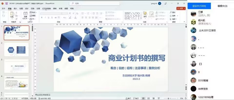 杨兴凯结合自己在电子商务“三创赛”中丰富的指导和评审经验,介绍了“三创赛”的赛事组织形式和全国赛事报名情况,详细解读了“三创赛”的评分标准,针对如何组队、选题要求、参赛注意事项和大赛项目的培育与指导等方面进行了经验交流,重点对商业计划书的撰写、PPT制作、路演及答辩技巧进行了详细讲解,并结合具体项目案例进行对比分析,对计划书撰写、PPT制作和答辩环节中存在的问题给出了指导意见。在互动环节,同学们踊跃提问,杨老师认真答疑解惑,让同学们获益良多。