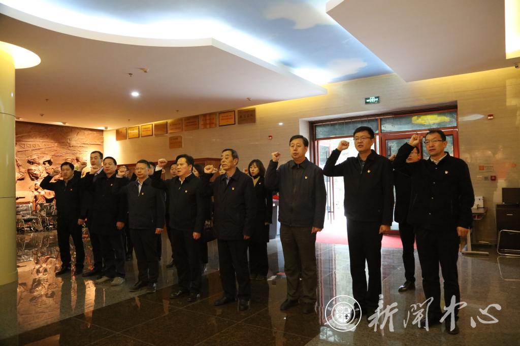 狄生奎一行在纪念馆展厅巨幅雕像前庄严肃立,怀着无比崇敬的心情,向革命烈士敬献花篮。狄生奎缓步上前,仔细整理缎带。随后,大家一起向革命先烈三鞠躬,表达对革命先烈的深切缅怀。鲜红的党旗前,大家再次重温入党誓词,铿锵有力的宣誓,表达了大家对党的无限忠诚、热爱和听党话、跟党走的坚定决心。