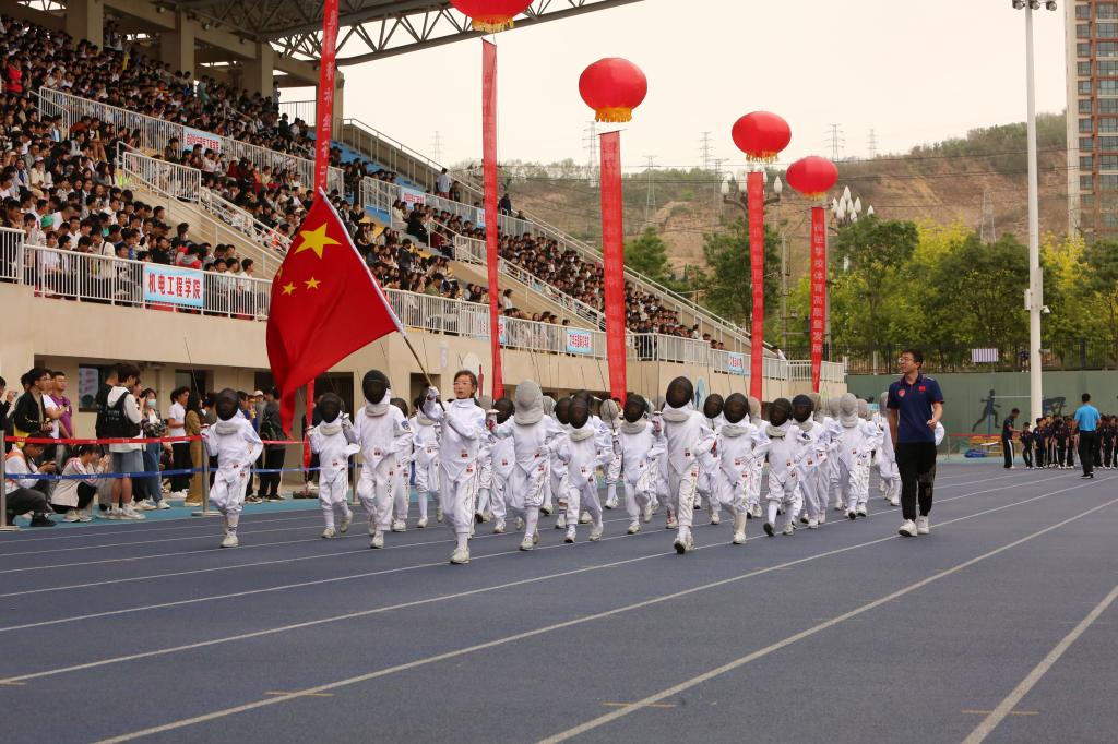 随后,我校无人机协会带来多机编队航模表演,航模在高空做起翻滚、拉烟、倒转等高难度动作,现场欢呼声雷动。开幕式上,大学生民族传统体育表演“武动青春”、留学生文体表演“流光溢彩”、大学生团体操表演“铸就辉煌”等节目依次上演,参加表演的人员热情洋溢、精神饱满,一举一动绽放出青春的激情,一张一弛诠释着生命的灵动,举手投足间展现出昂扬的姿态,充分展示了我校体育教学取得的成果。