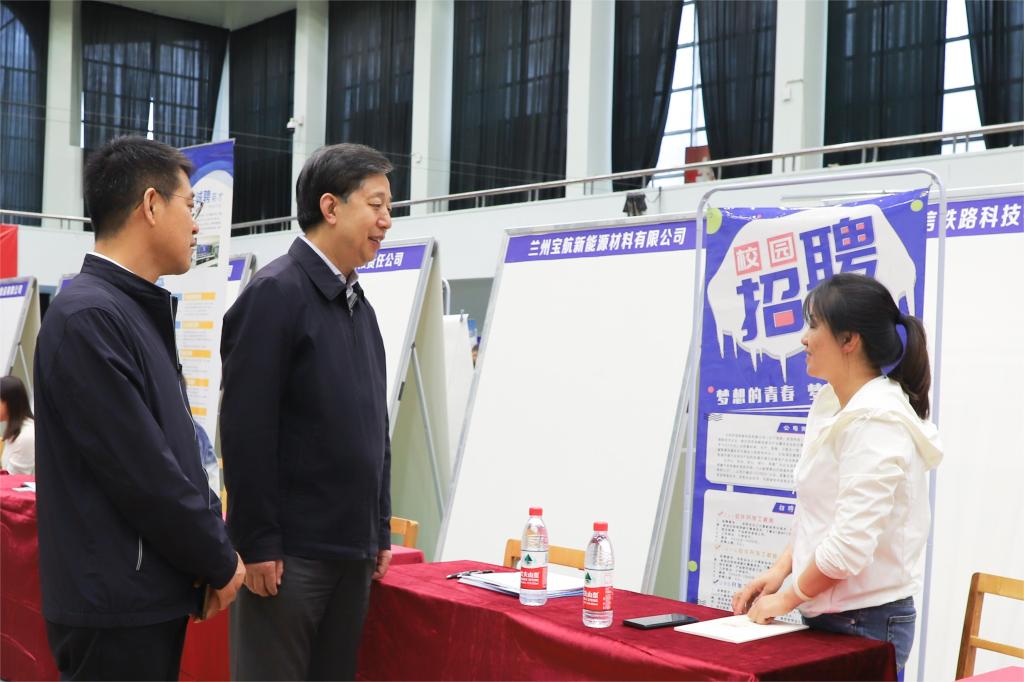 甘肃省教育厅学生工作处处长薛贵勇一行三人来校指导工作,学校党委常委、副校长马军党陪同。薛贵勇一行到现场与用人单位和求职学生进行交流,了解用人单位招聘情况和毕业生求职状况。我校各学院就业工作负责人也来到招聘会现场,积极了解企业人才需求,向用人单位推荐毕业生。