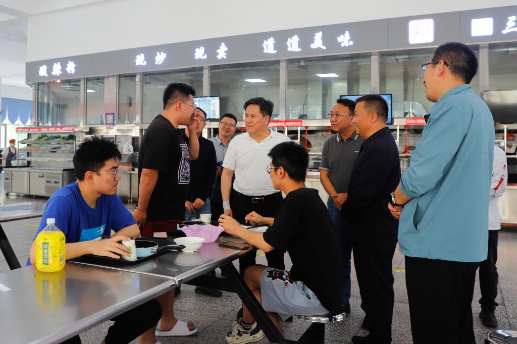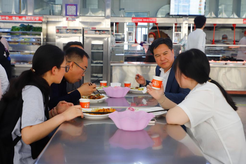 “同学,你是哪个学院?什么专业?”“这一顿午餐多少钱?感觉贵不贵?”“食堂饭菜合不合你的胃口?”“你是哪里人?”“学习怎么样?哪门课程比较难?”“你觉得哪位老师的课上的好?”“喜欢什么体育项目?”“毕业后有什么打算?”……狄生奎在朝阳餐厅与同学们一起排队打餐,在餐桌上与同学们亲切交谈,嘘寒问暖,详细询问大家学习、住宿和饮食等情况。同学们也放下了平日的拘谨,倾诉自己学习中的体会、生活上的建议以及思想上的困惑。就同学们反映的学习、生活等方面问题,狄生奎进行了现场解答,并现场交办相关职能部门落实解决。