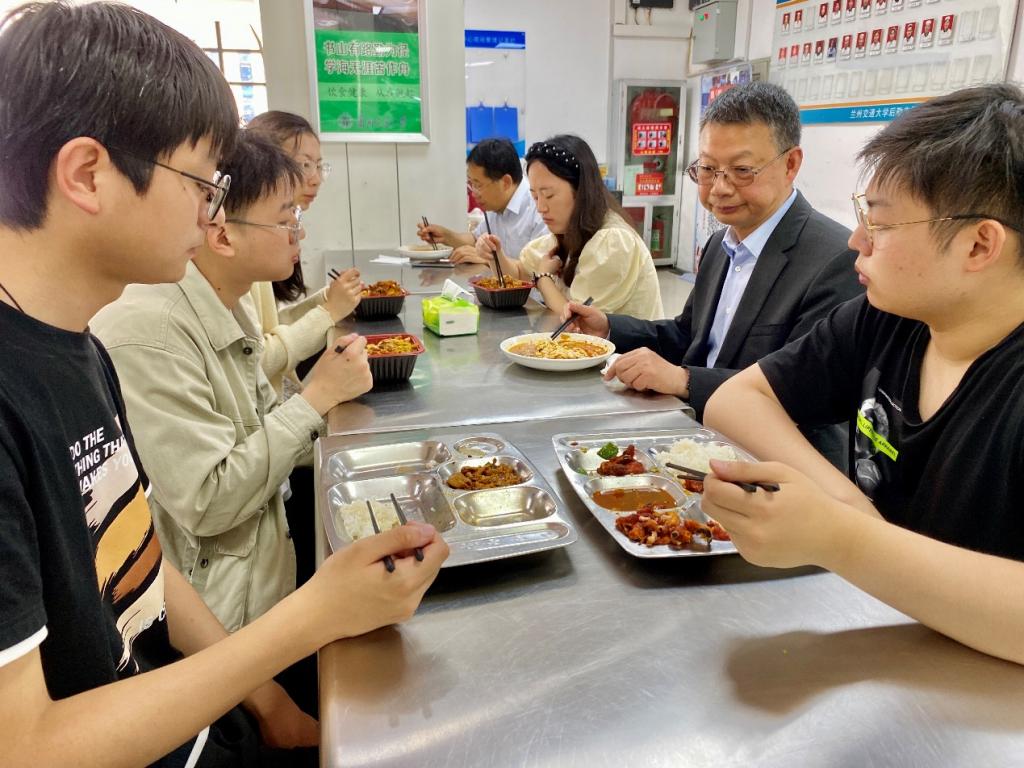 中午,同学们意犹未尽,纷纷邀请陈兴冲副校长与大家一起用餐。陈兴冲与同学们来到了南苑学生食堂,详细了解同学们的消费情况,询问饭菜的价格和质量是否满意。当看到窗口里摆满种类繁多,丰盛可口的饭菜,陈兴冲回忆起自己在44年前来到交大求学时,同学们的桌上大多都是些粗粮,意味深长的叮嘱同学们“一粥一饭,当思来处不易;半丝半缕,恒念物力维艰”,要在生活中养成勤俭节约,吃苦耐劳的好习惯,珍惜祖国来之不易的发展成果,成为能吃苦,敢担当,有理想,肯奋斗的新青年,投身于全面建设社会主义现代化国家的火热实践中。