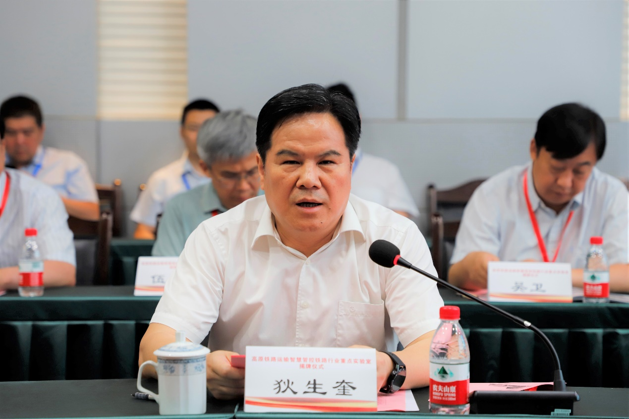狄生奎从校史沿革、学科优势、办学基本情况、重点实验室等方面对学校的发展和建设进行介绍。他指出,“高原铁路运输智慧管控铁路行业重点实验室”的成立,可助力我校交通运输工程学科在国家一流学科建设中实现新突破,对推动我国铁路行业科技创新和可持续发展具有重要意义。同时,为建设好重点实验室,狄生奎提出四点建议:一是瞄准国家重大战略需求,勇攀科技高峰。二是坚持关键问题导向,合力攻坚克难。三是立足西部高原交通特色,支持区域发展。四是全力建设一流专业平台,培育优质人才。