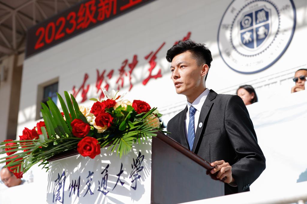 硕士生李明昕代表全体在校生发言,鼓励大家努力追寻大学生活里的意义。“交大不仅能为我们提供雄厚的师资力量和优质的教学环境,还能提供许多宝贵的社会实践和创新创业机会,帮助我们审视自己、觉察自己、认识自己、接纳自己。”他说,希望我们传承兰交大“尚德励志、博学笃行”的校训,弘扬“奋发向上,艰苦朴素、刻苦钻研、严谨治学”的校风,勤而行之、日有所进,立足华夏土壤,通达四方学问,成长为全面发展的时代新人,在青春的赛道上跑出当代青年最好的成绩。