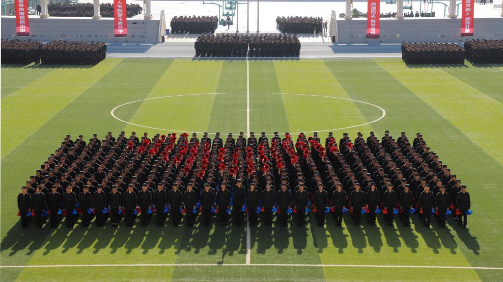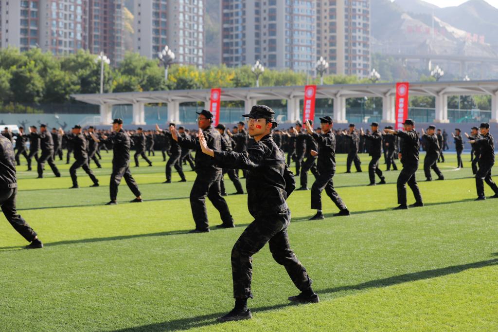 军事训练成果汇报表演中,新生学员先后进行了花束方阵表演、擒敌操展示、匕首操展示、警棍展示、战术展示等表演。花束方阵表演,巾帼不让须眉,动作规范,步调一致,掌声不断。同学们通过变换手中扇形花束和阵型变换展示出变化多样的数字效果和“中国”“65”等文字字样,来表达自己对党和祖国的热爱以及对学校65周年华诞的祝福;擒敌操虎虎生威,血气方刚,一招一式散发着无人能敌的自信;匕首操干净利落,警棍术气势如虹。同学们以嘹亮的口号,展现青春风采,喊出时代强音;战术展示表演中,灵敏的侦察、精准的信息传递、利落有效的火力打击、灵活的队形变换、一招制敌的近身格斗赢得现场阵阵掌声。执训教官带来倒功操展示,英姿飒爽,整齐划一,展示出军人服从命令、听从指挥的优良作风。