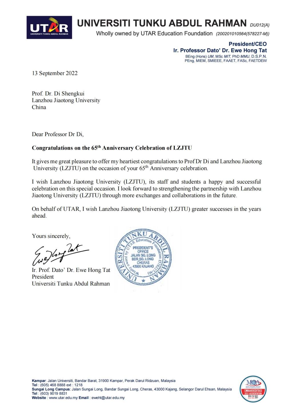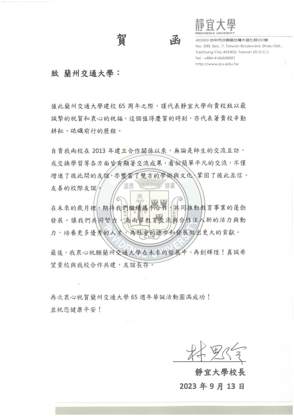 丹桂飘香秋意浓,金秋时节硕果丰。在学校建校65周年之际,我校国(境)友好合作院校纷纷发来贺信表示祝贺。