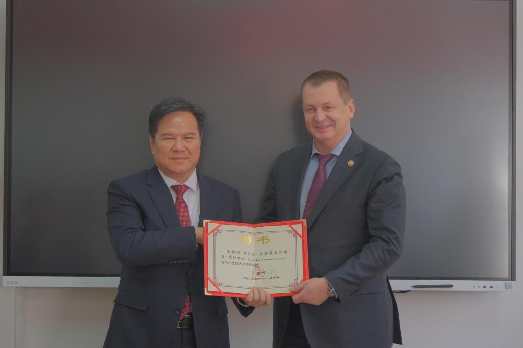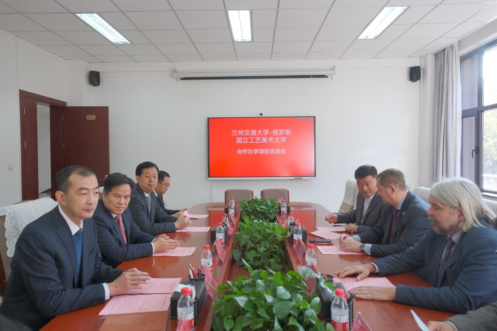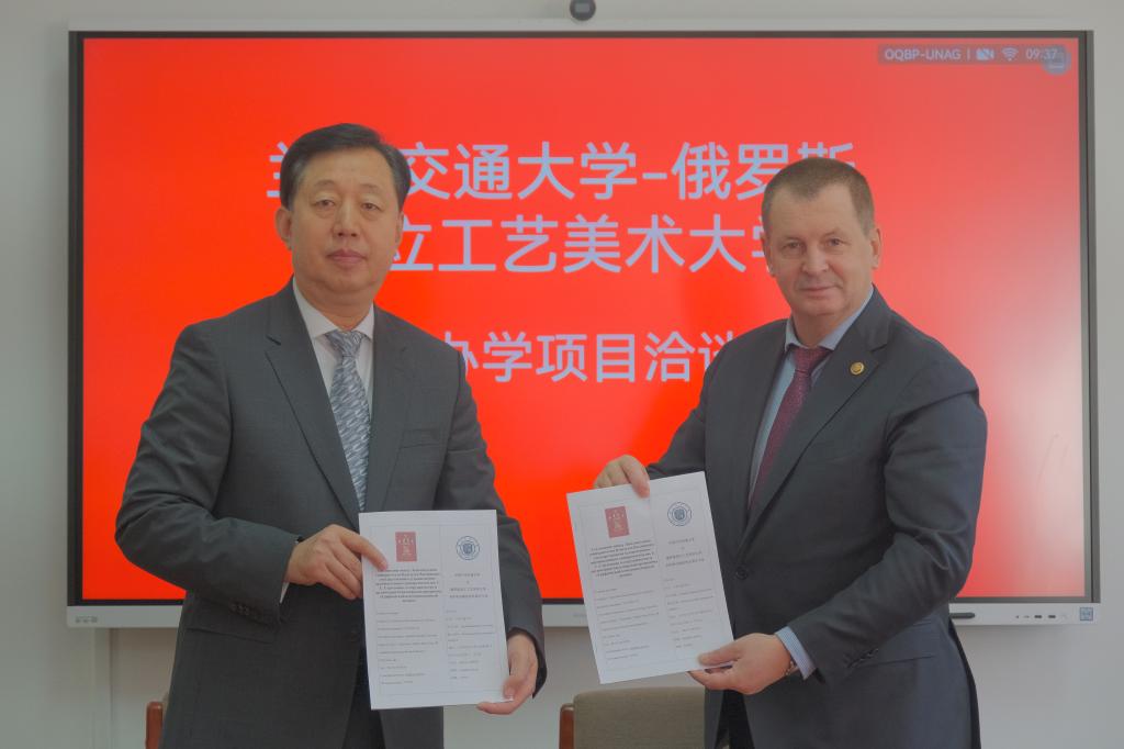 马军党与谢尔盖作为双方代表签署《兰州交通大学与俄罗斯国立工艺美术大学本科教育项目协议书》。狄生奎为谢尔盖校长与罗马什科教授二人颁发荣誉教授聘书,马军党为郭晓宾院长颁发客座教授聘书。