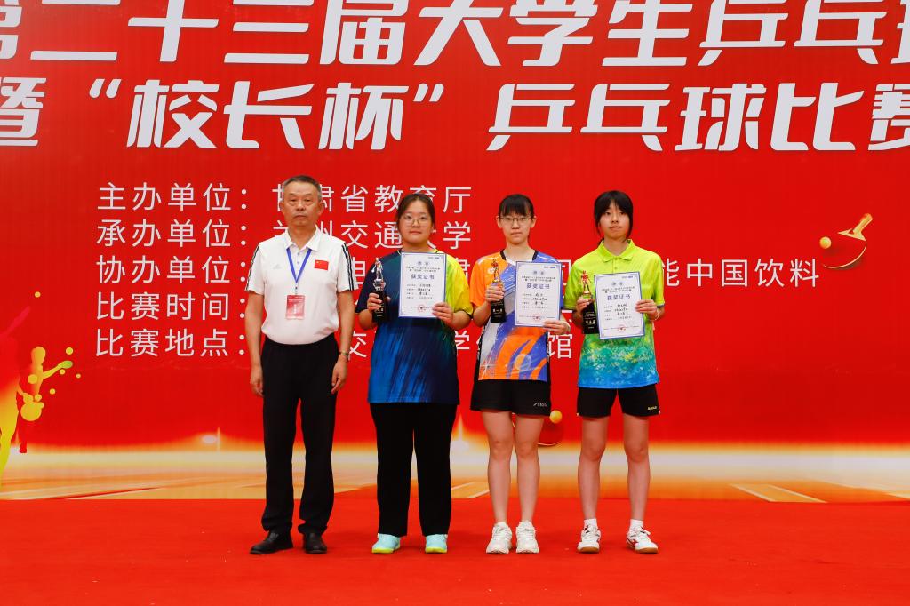 学生甲组女子单打第一名西北师范大学赵力、第二名甘肃中医药大学刘许之説、第三名兰州城市学院郭元琳。