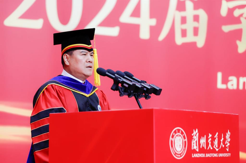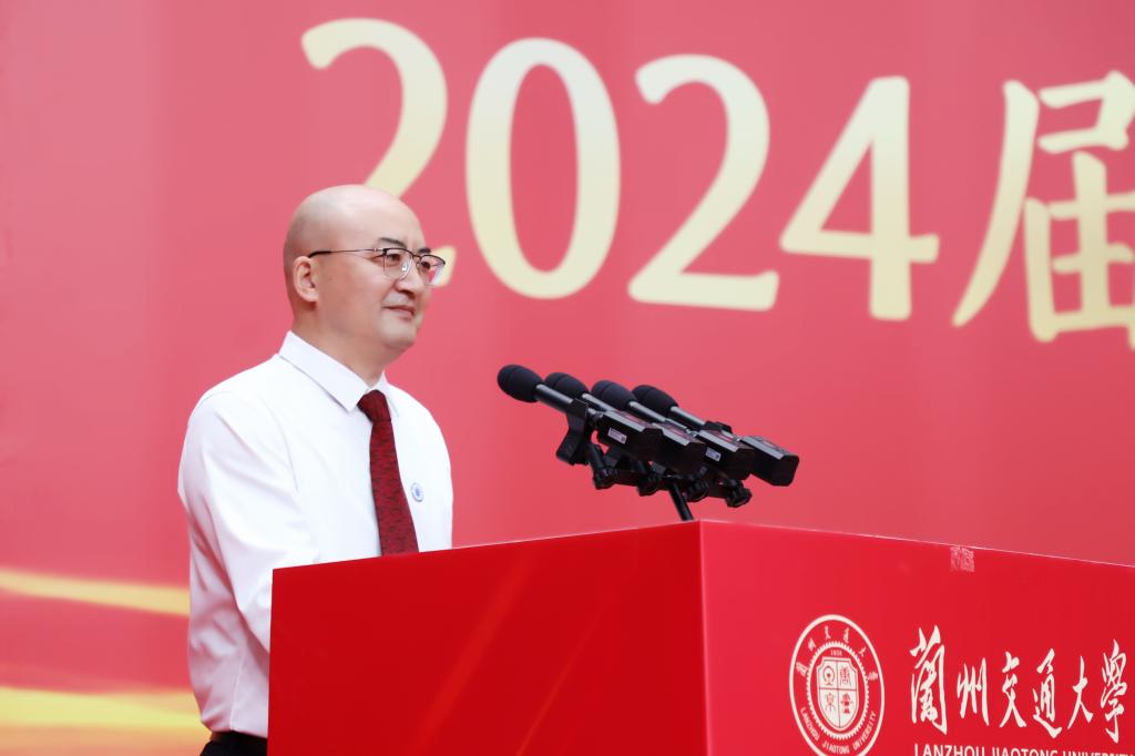 狄生奎代表学校向毕业生们送上热烈的祝贺和美好的祝福,并作题为《以青春之名 赴时代之约》的讲话。他表示,求学时光镌刻了同学们不平凡的青春印记,学校见证了同学们从青涩懵懂到坚定自信,看到了大家在青春赛道上奋力奔跑的模样,看到了新时代兰州交大学子的责任与担当。同学们也见证了学校的快速发展,见证了学校坚定地走出了一条以轨道交通为核心的特色办学之路。在新征程上,学校将主动融入教育强国、交通强国战略,推动教育、科技、人才协同发展,积极培育新质生产力,赋能高质量发展。