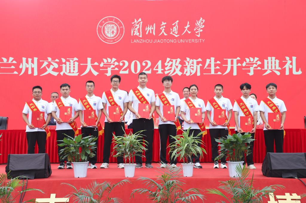 典礼上举行了新生佩戴兰州交通大学校徽仪式。校领导为新生代表戴上了“兰州交通大学校徽”,全体同学将校徽庄重佩戴在胸前。胸前闪耀的校徽,是肩上责任,是心中理想,更让每一位新“交大人”脚下充满力量。从此,每一名新生便与兰州交通大学血脉相连,他们将“尚德、励志、博学、笃行”的校训铭记在心,把青春融入党和人民事业,向着奋进之路、逐梦之旅出发。