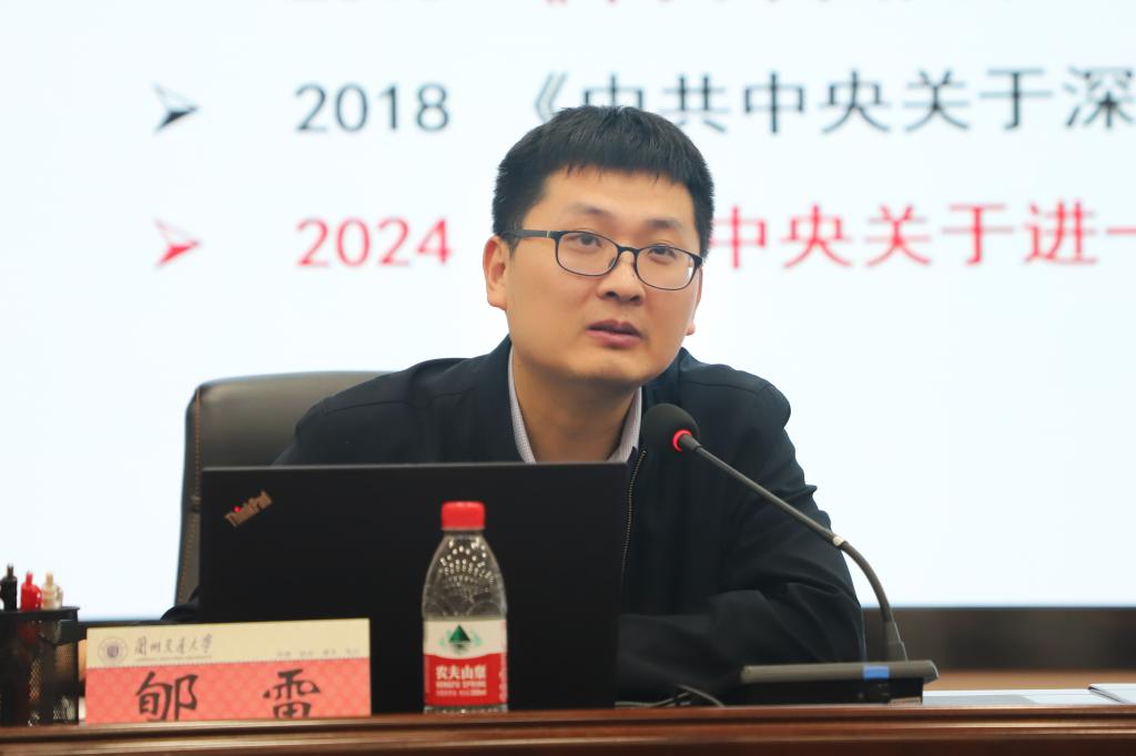 郇雷教授以《习近平关于发展新质生产力的重要论述》为题作专题辅导报告,详细讲解了发展新质生产力的科学内涵、时代背景和有效路径。郇教授对发展新质生产力的时代背景进行了剖析,强调发展新质生产力对我国经济社会发展及更好应对国际挑战有着非常重要的意义,并从构建高水平社会主义市场经济体制、不断适应社会生产力发展调整生产关系、处理好传统产业升级与新兴产业培育关系及处理好产业链供应链关系等宏观角度提出了发展新质生产力的有效路径,指出高校要全面落实科教兴国战略,为发展新质生产力贡献更大力量。