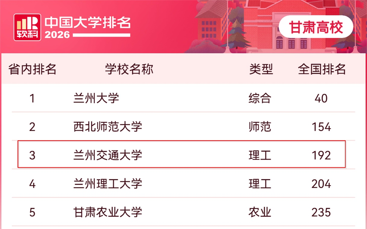 4月15日,全球领先的高等教育评价机构—软科发布“2026软科中国大学排名”,兰州交通大学位列第192位,跻身全国200强,比2025年提升了17位。