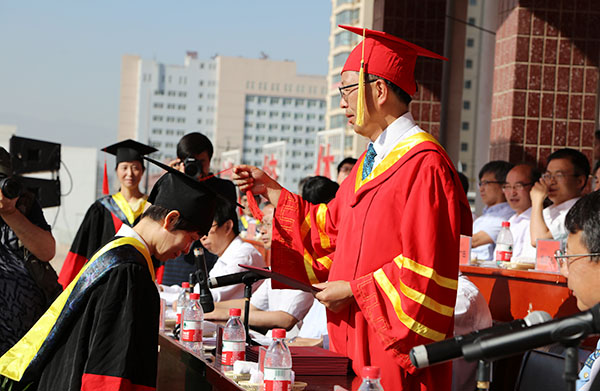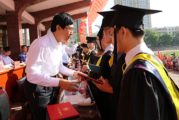仪式最后,伴随着欢快的乐曲,校长、学位评定委员会主席杨子江教授为2017届毕业的博士研究生、硕士研究生代表正冠拨苏、颁发学位证书;出席典礼的领导及嘉宾为2017届本科毕业生颁发了毕业证书和学位证书,为2017届优秀毕业生颁发荣誉证书。