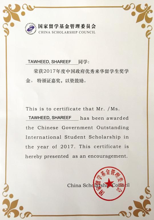 我校苏丹籍博士留学生喜获2017年度中国政府优秀来华留学生奖学金