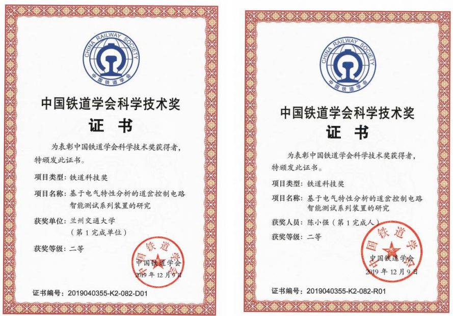 近日,中国铁道学会颁发了2019年度“中国铁道学会科学技术奖”获奖证书,我校研究成果获得一等奖1项、二等奖1项。该奖是铁路领域科技最高奖项。