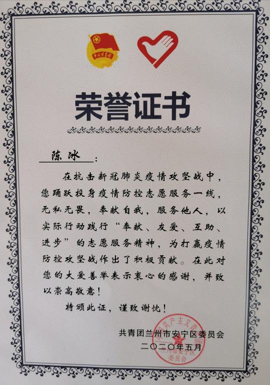 在抗击新冠肺炎疫情攻坚站中,田艳琴、陈冰两位党员教师踊跃投身疫情防控志愿服务一线,在生活小区、社区、甘肃蓝天救援队参加志愿服务工作,并为社区、救援中心、边远山区学校捐赠“防疫”物资,以实际行动践行“奉献、友爱、互助、进步”的志愿者精神,为打赢疫情防控阻击战做出了积极贡献。