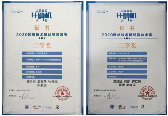 10月25日,2020年中国高校计算机大赛—网络技术挑战赛总决赛在温州浙南科技城落下帷幕。由李启南老师指导、计算机1903班陈自东等同学完成的作品《基于HiDDeN的载体图像研究》获本科组全国二等奖,由杨桂芹老师指导、电信学院研究生樊婧媛等同学完成的作品《SDN环境下基于增强学习的KNN-SVM的DDoS攻击检测系统》获研究生组全国三等奖,创我校历年参赛以来最佳成绩。