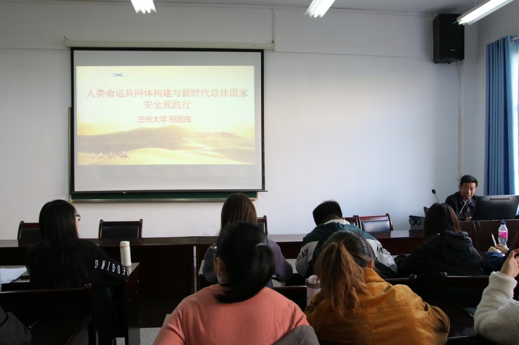 倪国良结合国内外最新形势和热点问题,以“人类命运共同体构建与新时代总体国家安全观践行”为主题,着重从四个方面进行了阐述:一是人类命运共同体概念的提出及其含义;二是国际形势与人类命运共同体的构建;三是以新时代总体国家安全观为指导推进人类命运共同体的构建;四是在践行总体国家安全观中推进人类命运共同体的构建。倪国良在讲授过程中,对人类命运共同体构建与新时代总体国家安全观之间的辩证统一关系,既进行了深刻的学理分析、又穿插了生动的事实叙述,深入浅出、娓娓道来、引人入胜,让在场师生沉浸在轻松愉快的气氛之中,全面理解和把握了目前的国际形势和“一带一路”倡议等国家重大对外战略,报告赢得了大家的高度认同和一致好评。