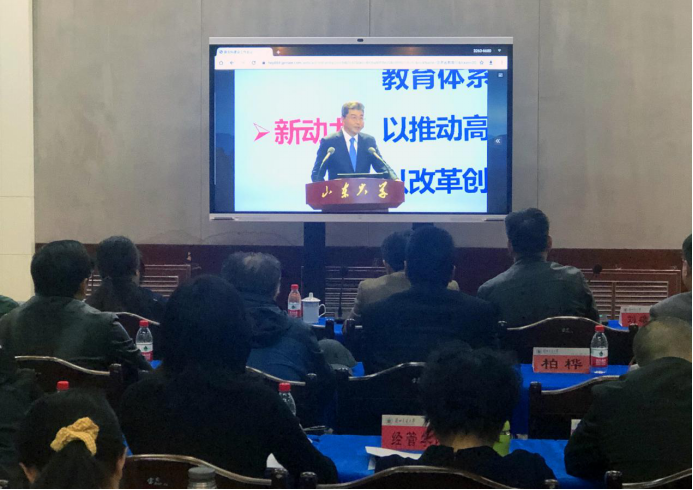 为了全面贯彻全国教育大会精神,落实新时代全国高等学校本科教育会议要求,全面推进新文科建设,构建以育人育才为中心的哲学社会科学发展新格局,加快培养新时代文科人才,促进学校内涵式发展,11月3日,由教育部新文科建设工作组主办的新文科建设工作会议在山东大学(威海)召开。我校组织观看视频会议,教务处、经济管理学院、文学院、外国语学院、马克思主义学院、艺术设计学院相关负责人,及各专业负责人、骨干教师30余人在国际会展中心中型会议室集中观看会议直播。