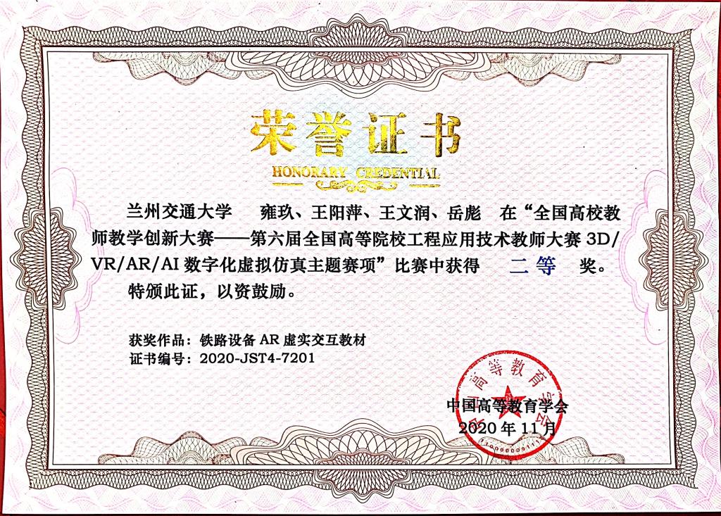11月10日上午,由中国高等教育学会主办的全国高校教师教学创新大赛——第六届全国高等院校工程应用技术教师大赛3D/VR/AR/AI数字化虚拟仿真主题赛项总决赛颁奖典礼在长沙举办,此次竞赛共有来自158所院校的246个团队入围国赛,96支团队获得国赛奖项。我校计算机科学与技术国家级实验教学示范中心教师雍玖、王阳萍、王文润和岳彪团队的参赛作品《铁路设备AR虚实交互教材》喜获全国总决赛二等奖。此次比赛是中国高等教育博览会(2020)的主要竞赛及相关活动之一。旨在促进高校教师工程实践能力和创造能力、弘扬工匠精神、助力新工科建设,提升高校教师对于3D/VR/AR/AI等数字化虚拟仿真技术的应用能力和开发能力。