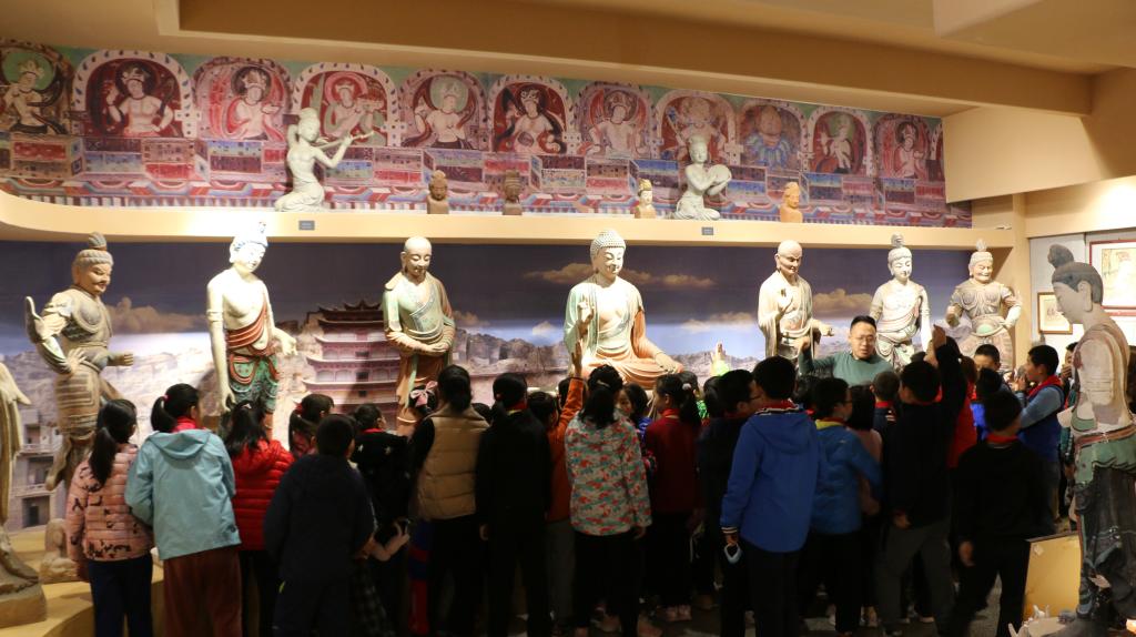 敦煌彩塑传承基地的老师从彩塑的发展历史、制作技艺、趣味知识与传承创新几方面为前来观展的师生做了详细讲解,并引导孩子们积极参与讨论。通过现场参观、观看视频短片等方式,同学们开阔了视野,了解了灿烂的敦煌文化。
