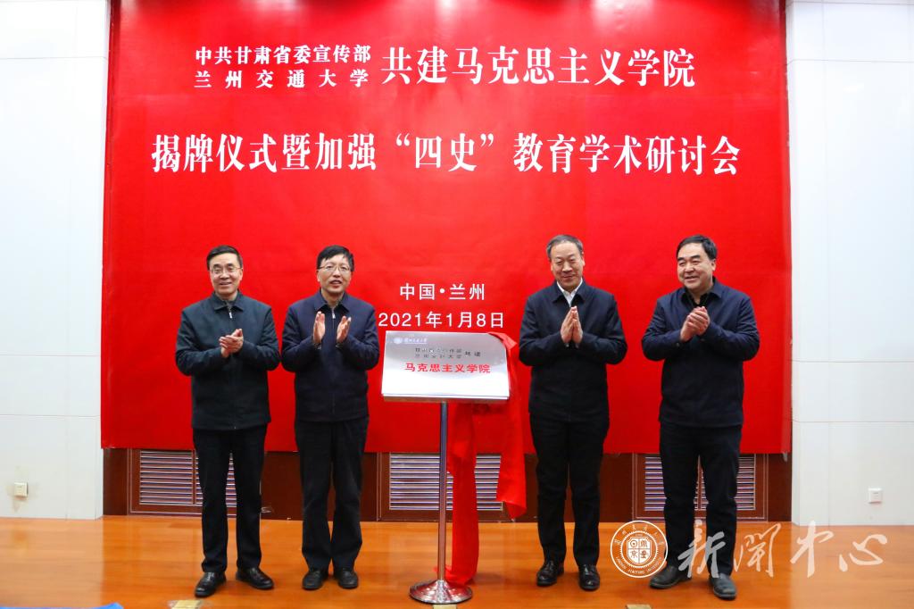 李庆武宣读了《省委宣传部关于与兰州交通大学共建马克思主义学院的回复意见》。王成勇、张晓东、杨子江、李引珍共同为共建马克思主义学院揭牌。