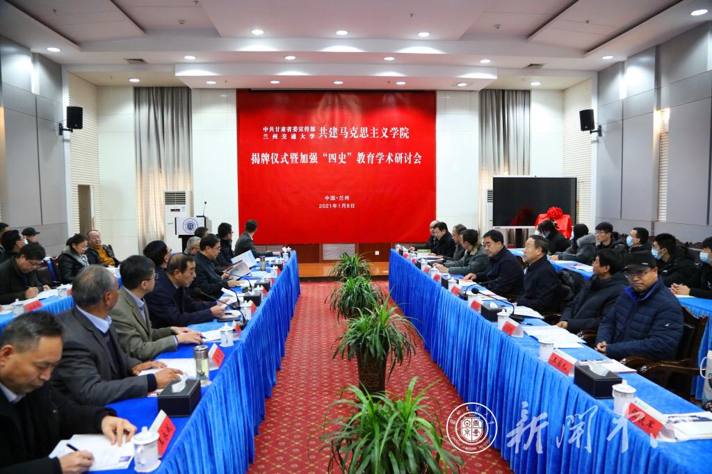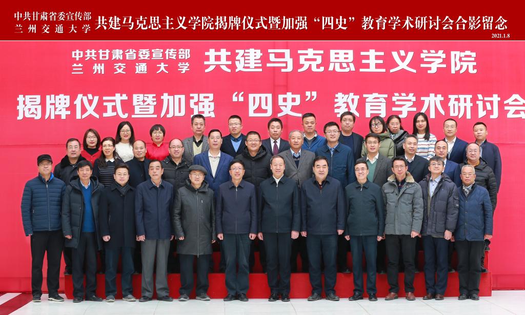 1月8日,中共甘肃省委宣传部与兰州交通大学共建马克思主义学院揭牌仪式暨加强“四史”教育学术研讨会在我校隆重举行。省委宣传部副部长、省新闻出版局局长王成勇,省委教育工委专职副书记张晓东,省委宣传部理论处处长李庆武,兰州交通大学党委书记杨子江、校长李引珍,学校有关部门负责同志出席揭牌仪式。兰州大学王学俭、陈文江、丁志刚教授,西北师范大学王宗礼、刘旭东教授,西北民族大学甄喜善、兰州理工大学张铁军教授等专家学者,以及我校马克思主义学院部分师生代表50多人参加仪式和研讨会。揭牌仪式由校党委副书记买寿清主持。