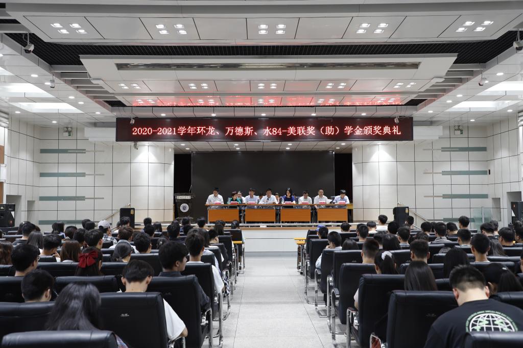 6月17日下午,2020至2021学年“环龙、万德斯、水84-美联”奖(助)学金颁奖典礼在我校五教萃英厅举办。