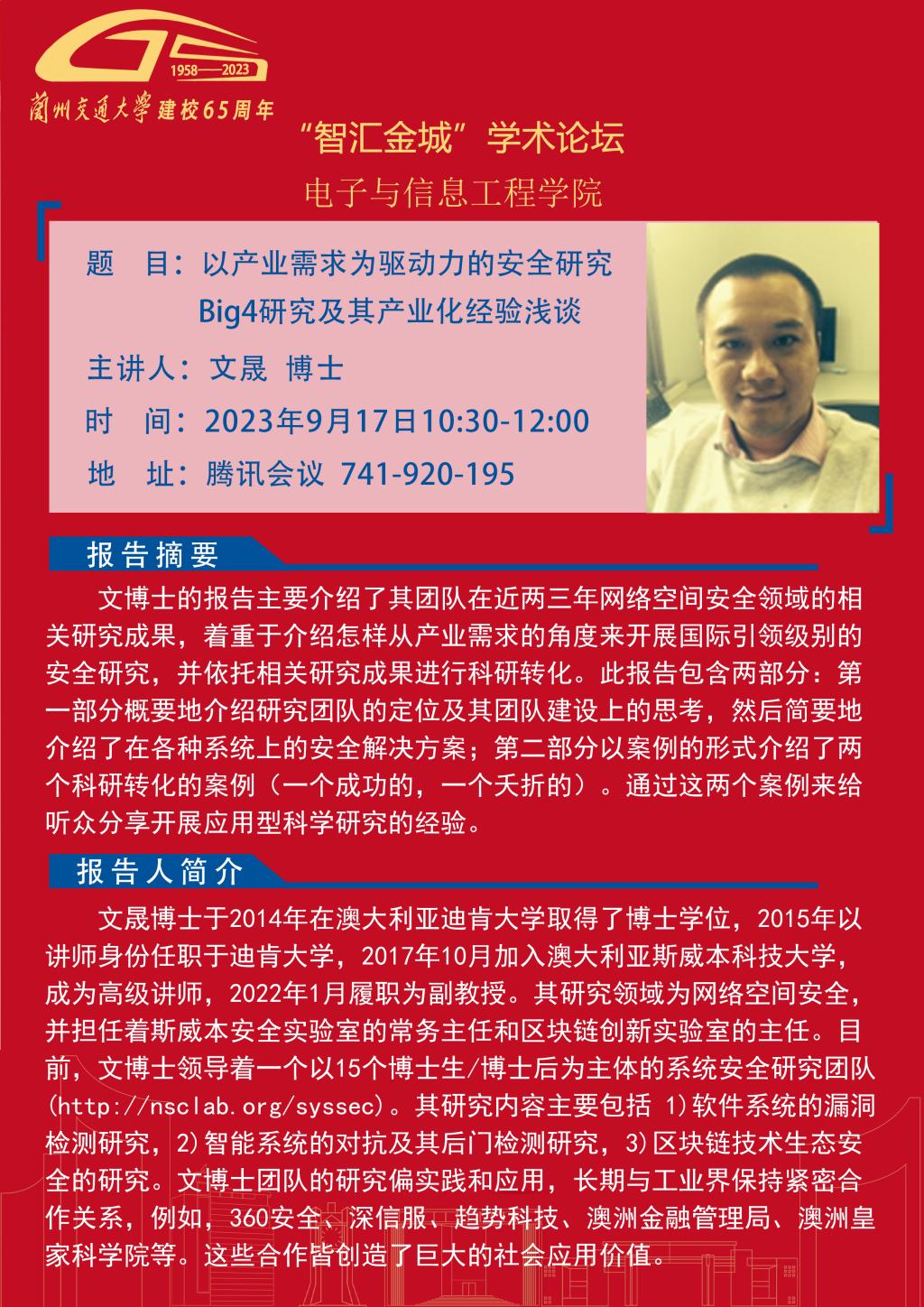 兰州交通大学“智汇金城”学术论坛预告——以产业需求为驱动力的安全研究:Big4研究及其产业化经验浅谈