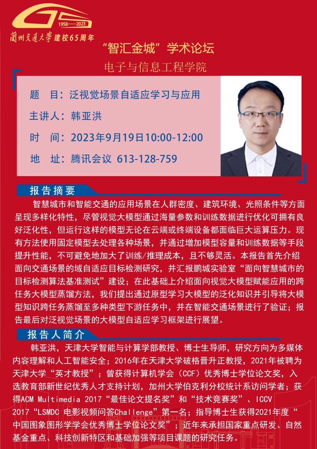 兰州交通大学“智汇金城”学术论坛预告——泛视觉场景自适应学习与应用