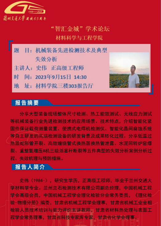 应材料科学与工程学院邀请,兰州兰石检测技术有限公司史伟(正高级工程师)将为全校师生作“机械装备先进检测技术及典型失效分析”学术报告。内容详见海报,欢迎全校师生参加!