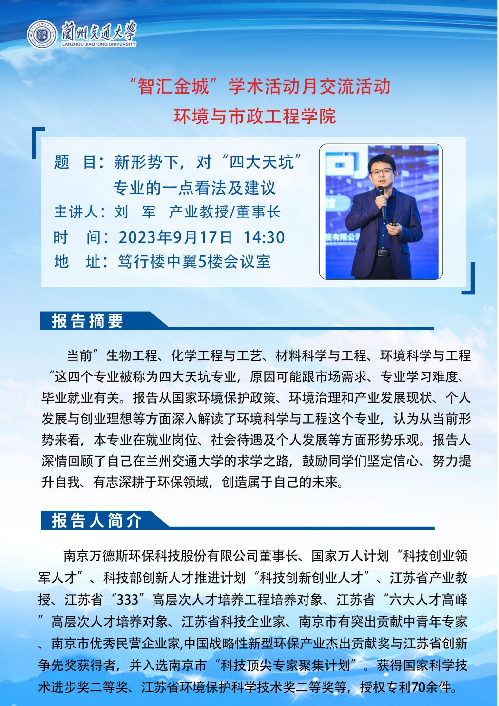 应环境与市政工程学院邀请,南京万德斯环保科技股份有限公司刘军董事长将为全校师生作“对“四大天坑”专业的一点看法及建议”之专题报告,内容详见海报。欢迎全校师生参加。