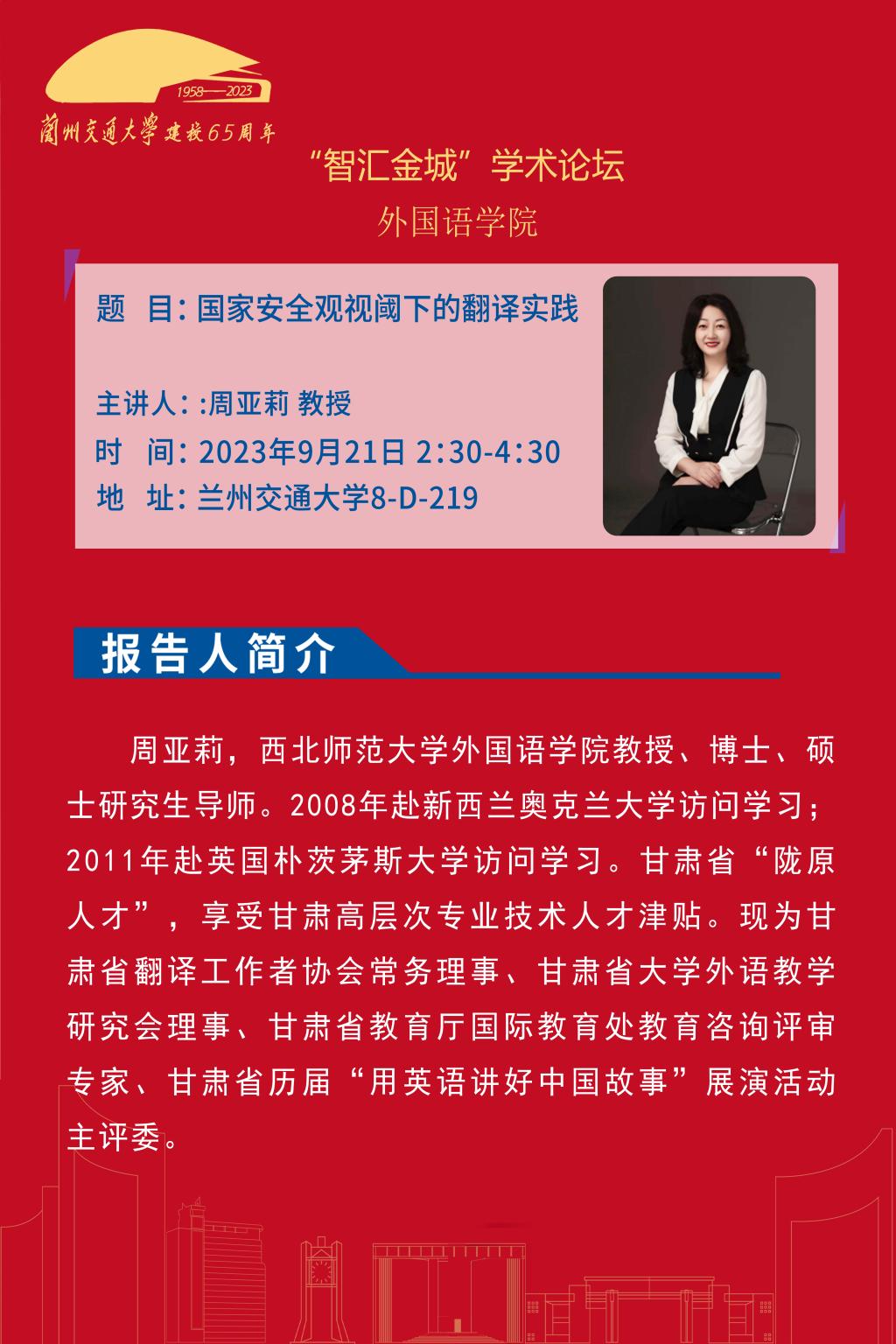 应外国语学院邀请,西北师范大学外国语学院教授周亚莉将为全校师生作学术报告,报告内容详情见海报。欢迎全校师生参加。