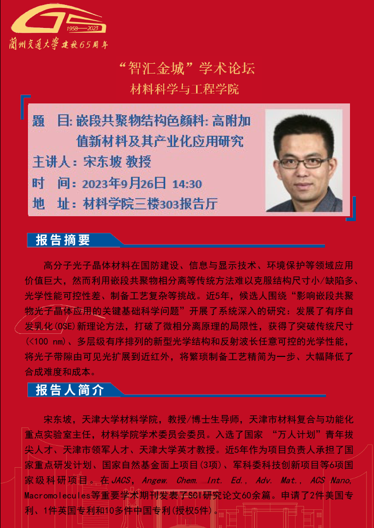 应材料科学与工程学院邀请,天津大学宋东坡(教授)将为全校师生作“嵌段共聚物结构色颜料:高附加值新材料及其产业化应用研究”学术报告。内容详见海报,欢迎全校师生参加!