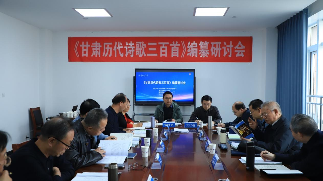 时维仲秋,群贤荟萃。为系统梳理甘肃千年诗脉,11月14日,一场聚焦陇原诗歌传承的文化盛会——《甘肃历代诗歌三百首》编纂研讨会在我校成功举办。本次会议由甘肃省先秦文学与文化研究中心、西北师范大学文学院、西北师范大学古籍研究所及兰州交通大学文学院联合主办。西北师范大学教授、甘肃省先秦文学与文化研究中心主任赵逵夫先生,天水师范大学校长汪聚应教授,与来自兰州大学、西北师范大学、甘肃中医药大学等多所高校的知名专家学者齐聚一堂,围绕诗集的编纂体例与选诗标准等核心议题展开深入研讨。会议由西北师范大学冉耀斌教授主持。