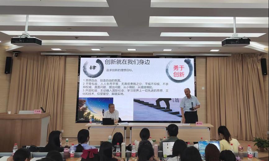 6月15日下午,兰州交通大学“大先生”讲“大思政课”系列讲座第二场报告在马克思主义学院举行,特邀甘肃省教育厅关工委副主任、原副巡视员、甘肃省诗词学会吟诵委员会副会长丁光明先生作了题为“创新是中华民族精神底色”的报告。马院全体师生共计150多人在笃行楼MBA中心报告厅参加了报告会,马院院长蔡中宏主持了报告会。