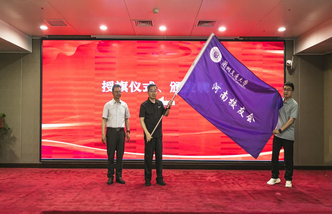 陈兴冲向新一届河南校友会会长授校旗和河南校友会会旗,苏程向新一届河南校友会理事会全体成员颁发了聘书。